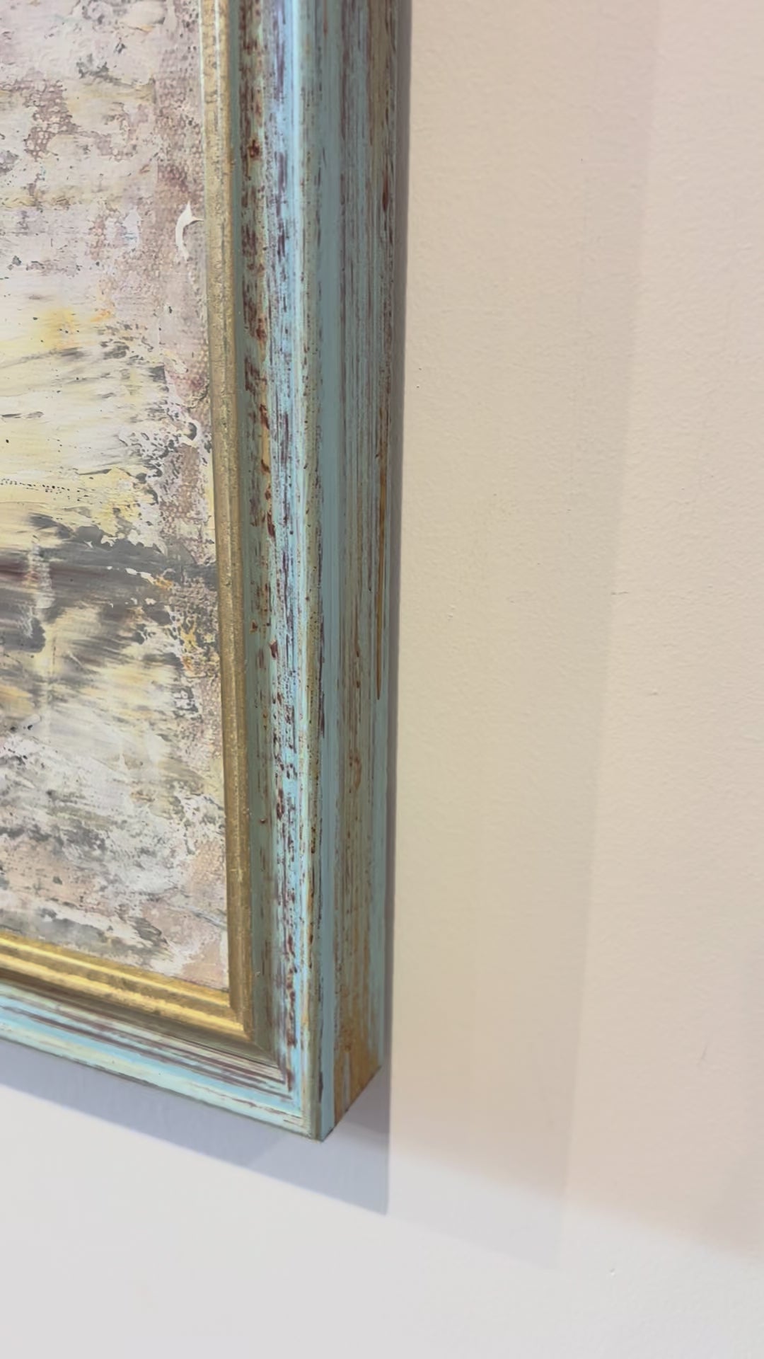 A richly layered abstract composition with warm ochres, pale blues and soft greys, creating depth and movement across the surface. A striking yet versatile work set within a distressed turquoise and gold-edged frame that suits both contemporary and classic interiors.