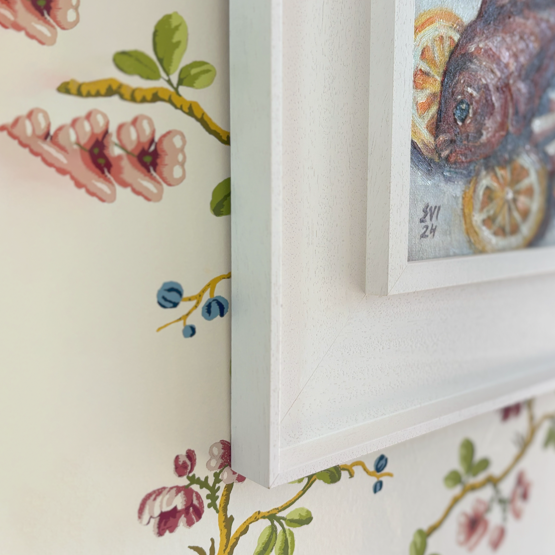 A quirky and colourful still life, this little fish is served up with a generous helping of lemon slices and charm. Finished in an off‑white painted frame with a broad profile that adds a crisp, modern touch.