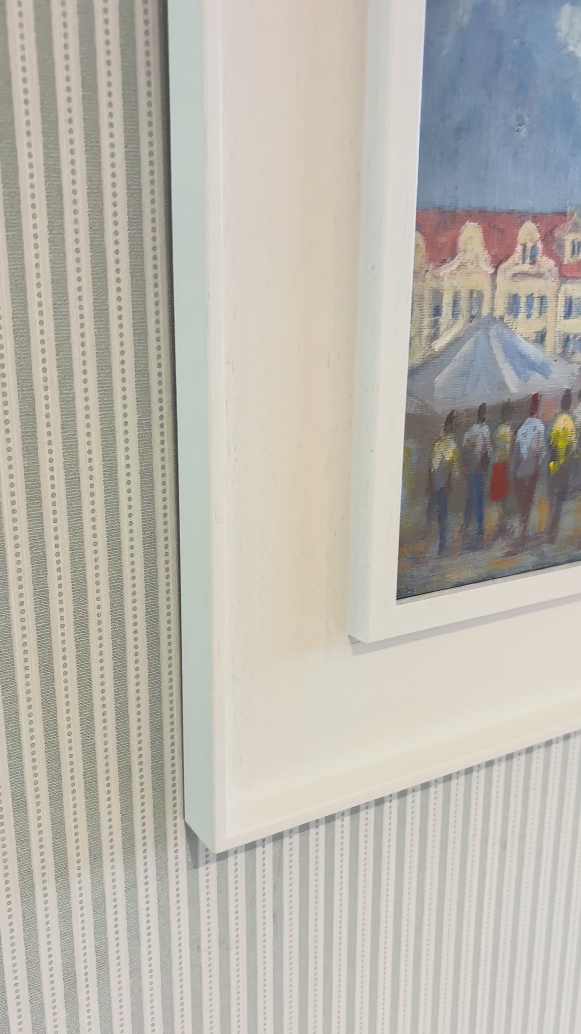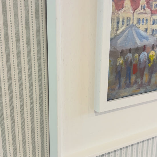 Full of life and colour, this original painting by G. Miller captures the buzz of a European market square. Framed in soft white wood for a fresh, contemporary finish.