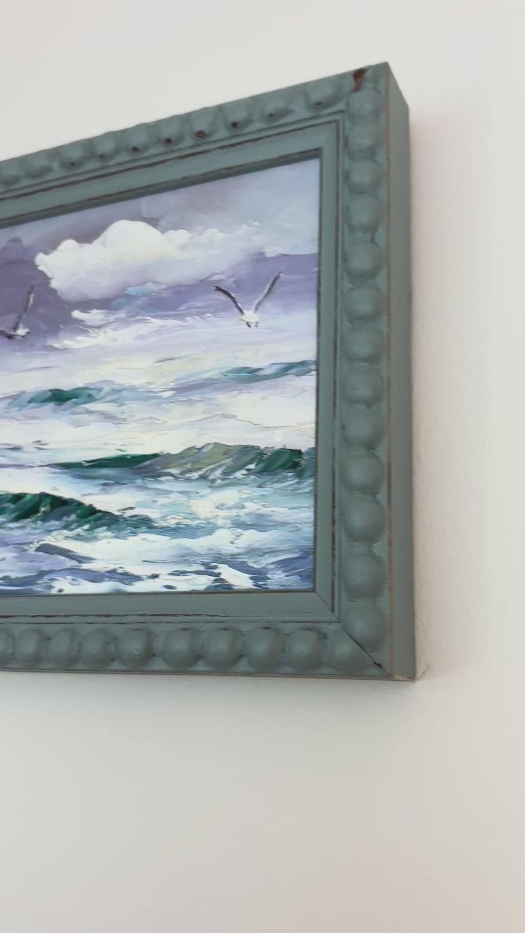 Alive with movement and colour, this petite artwork brings the power of the sea to any wall. Set in a charming painted bobbin frame.
