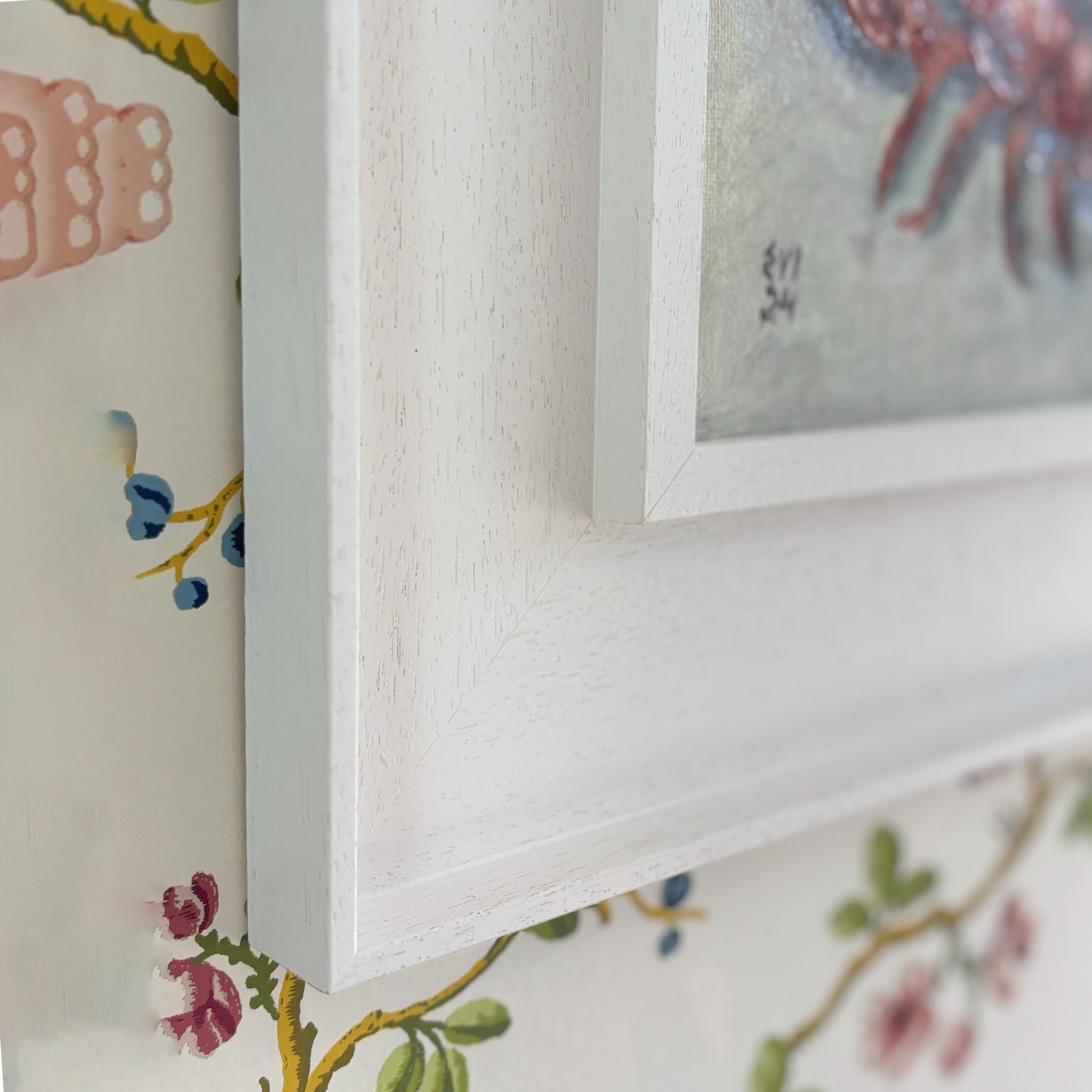 A small but punchy painting with great texture and personality. This lively little lobster is full of character, set against a soft background that lets the colour pop. Finished in a simple white painted frame with a wide mount.