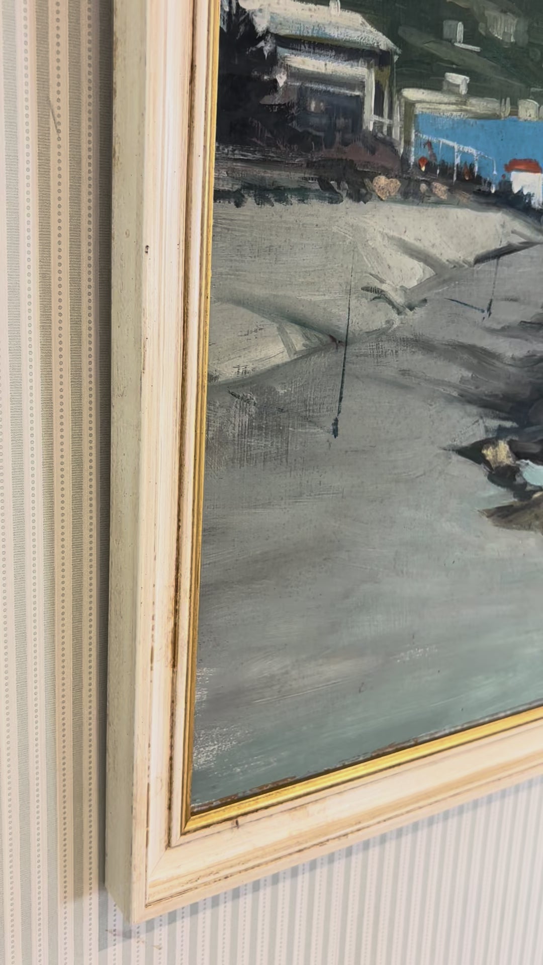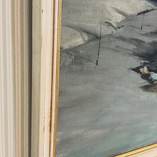 This large striking seascape captures the movement of the surf against the rugged coastline - reminiscent of British summertime. A timeless painting full of light and energy, presented in an off-white antique frame with gilt edging.
