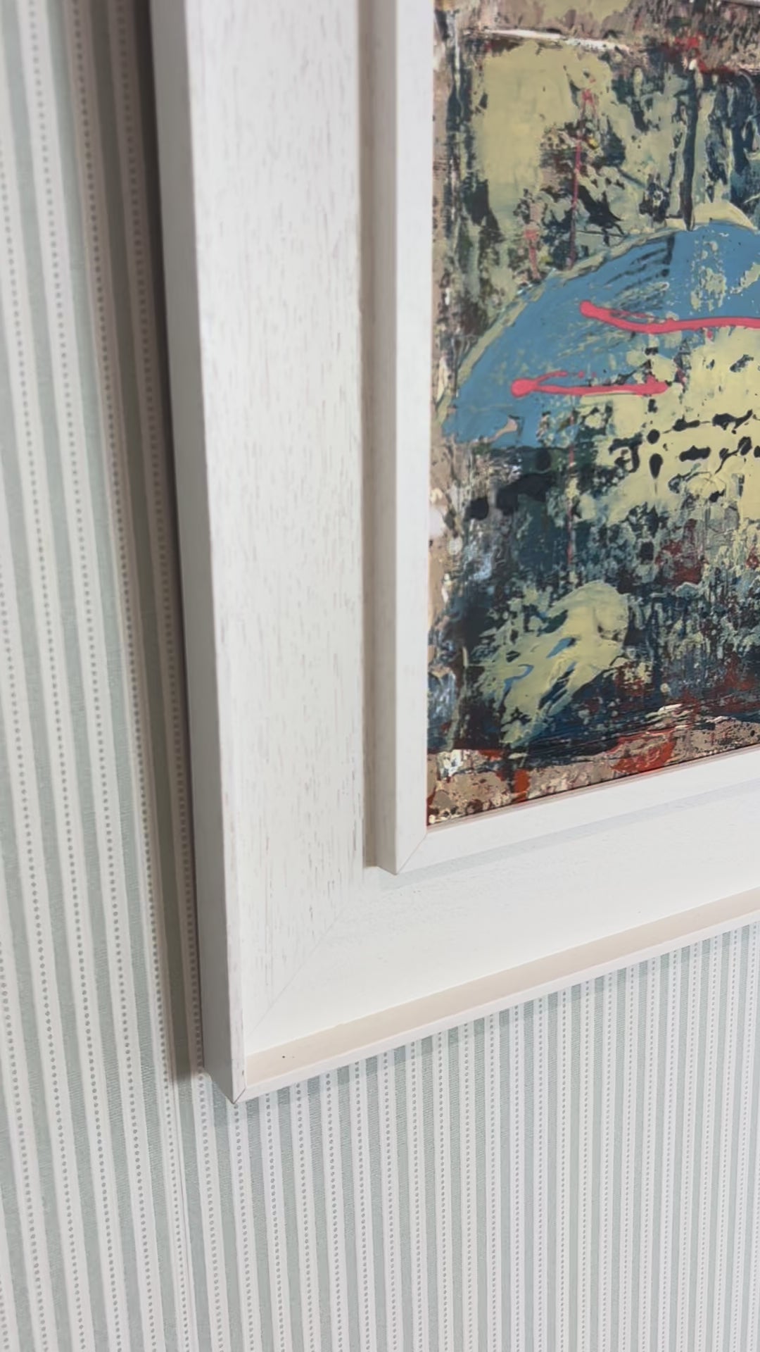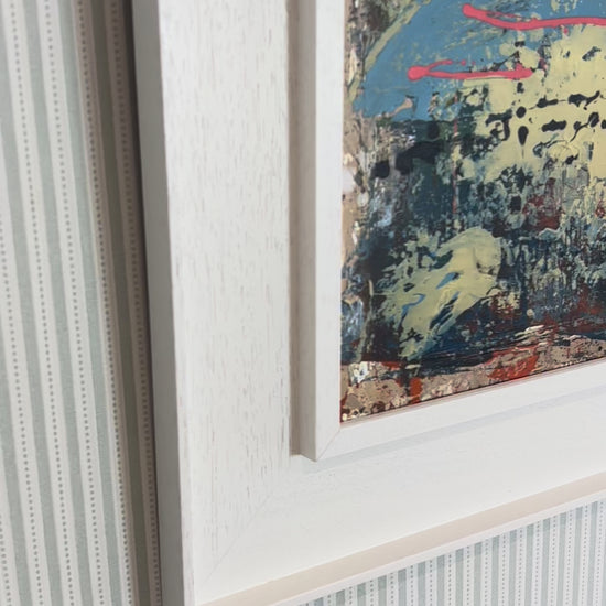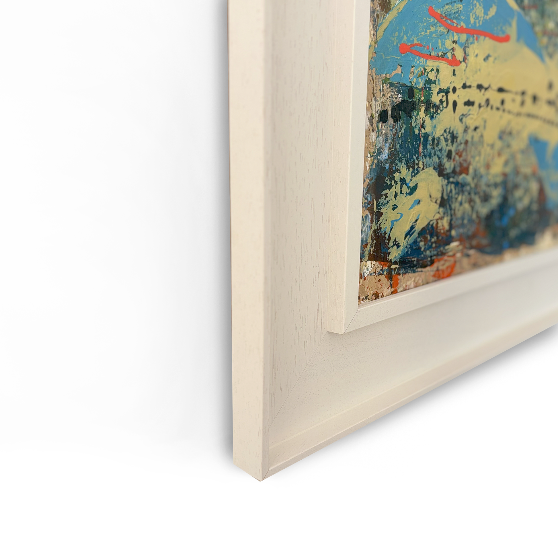 A spirited abstract piece with a sense of movement and adventure. Finished in an off‑white painted frame with a broad profile to complement a range of wall spaces.