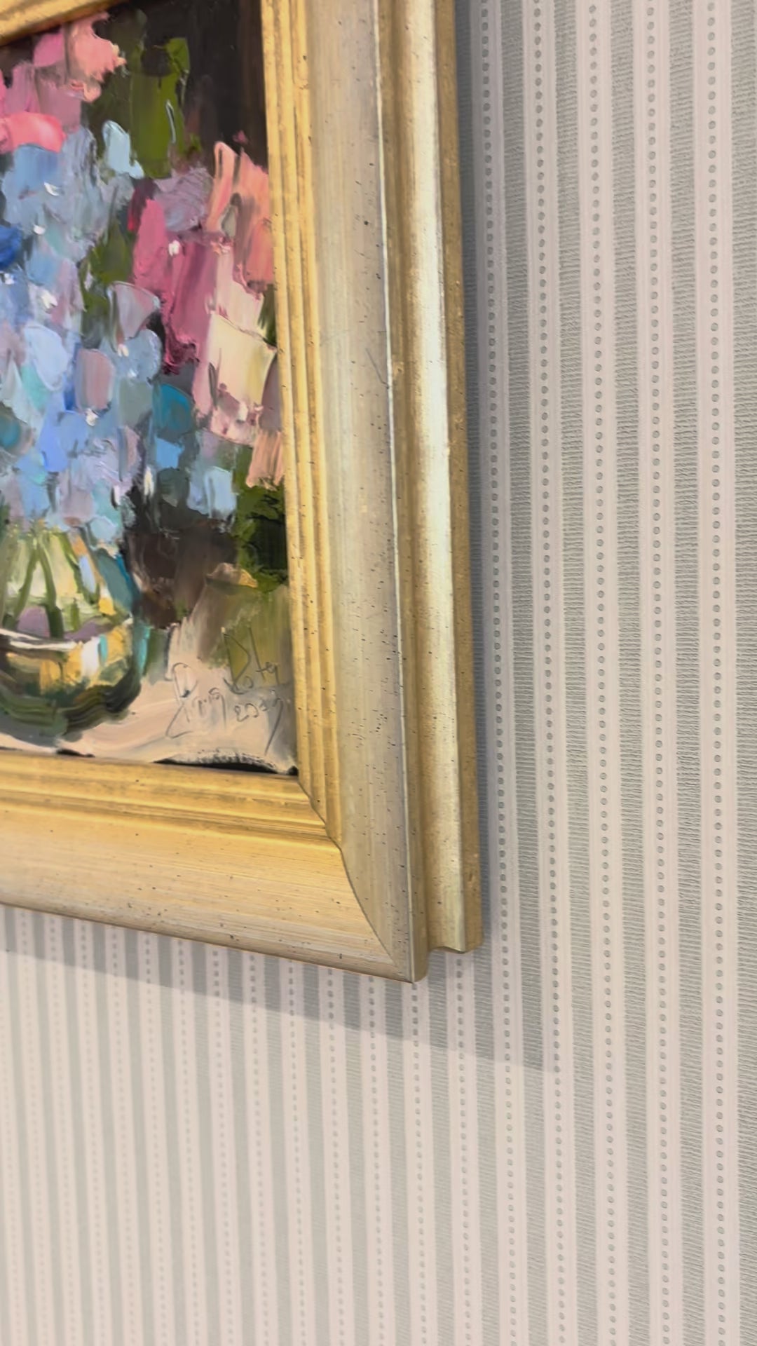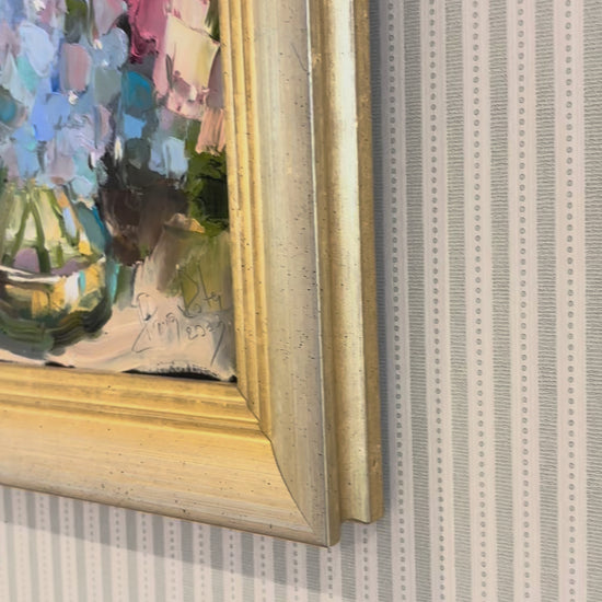 This vibrant and uplifting original is full of colour and texture. Thick, impasto brushwork brings the petals to life, while the elegant gilt frame adds a touch of classic charm.