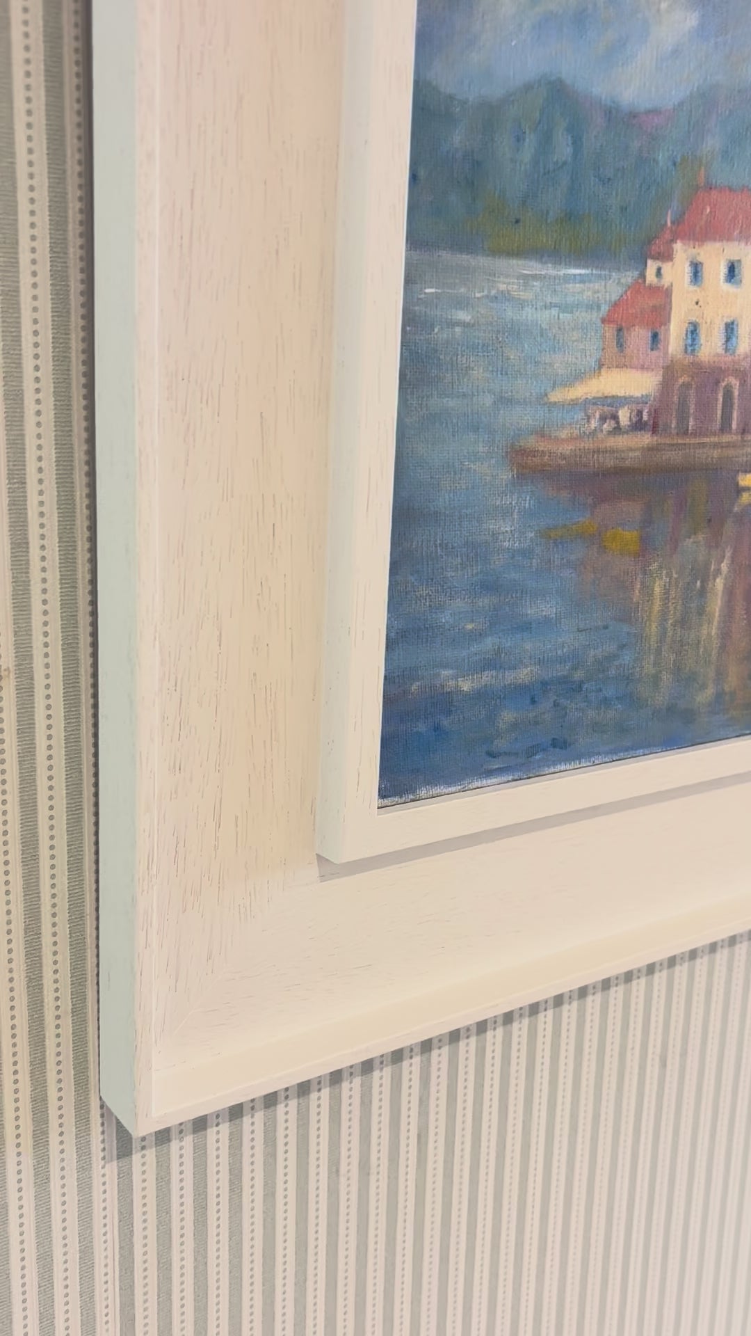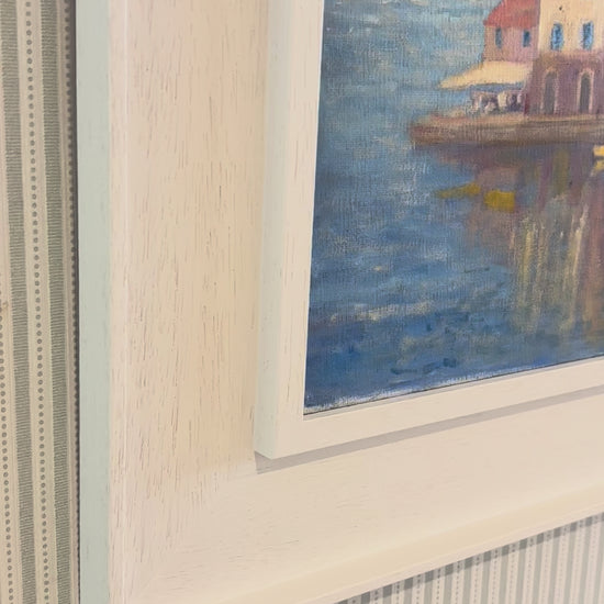 A lively scene of a colourful waterfront town where boats line the shore, and their reflections shimmer on the water’s surface. Presented in a soft white frame enhancing its charm and allure.