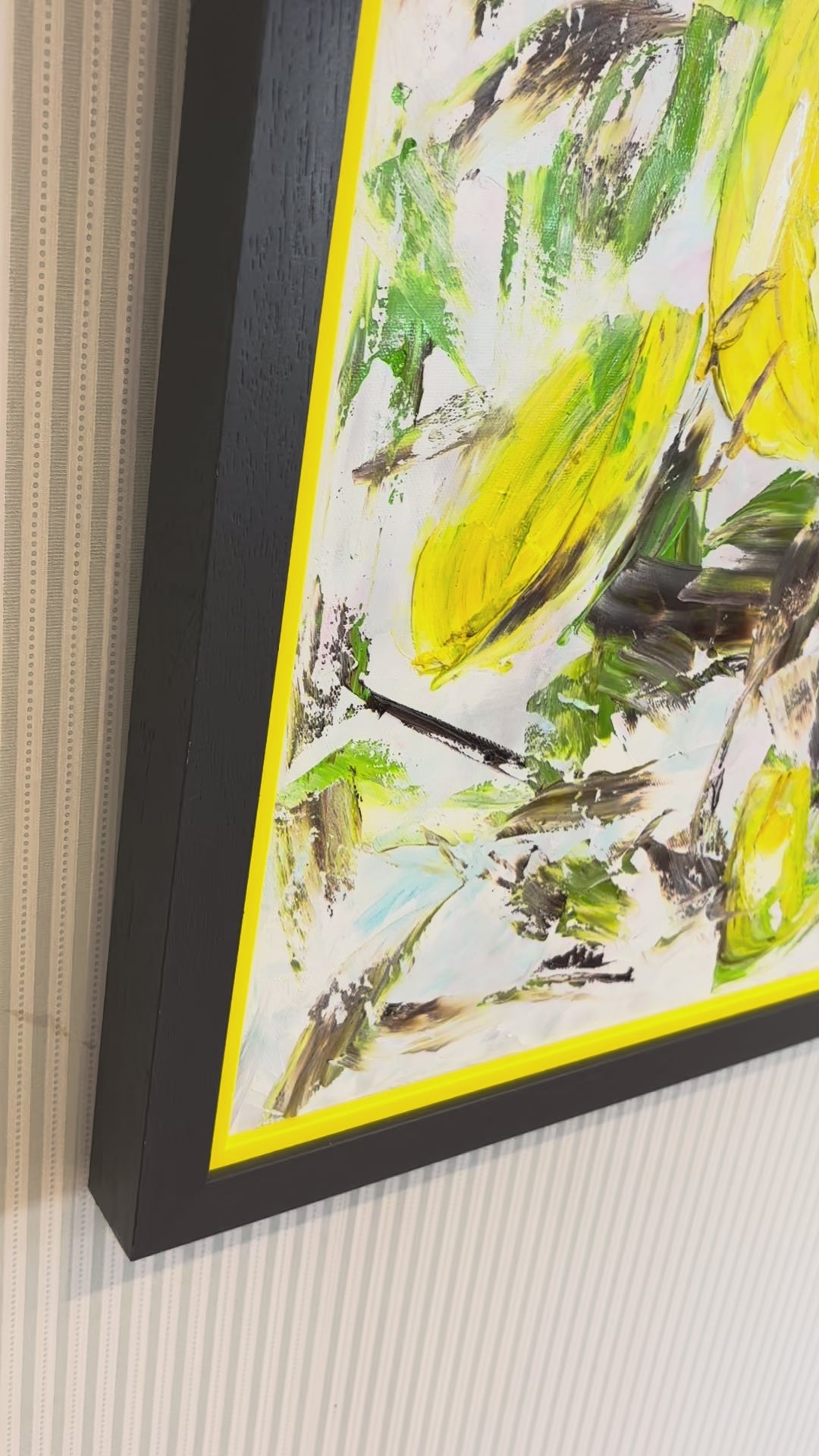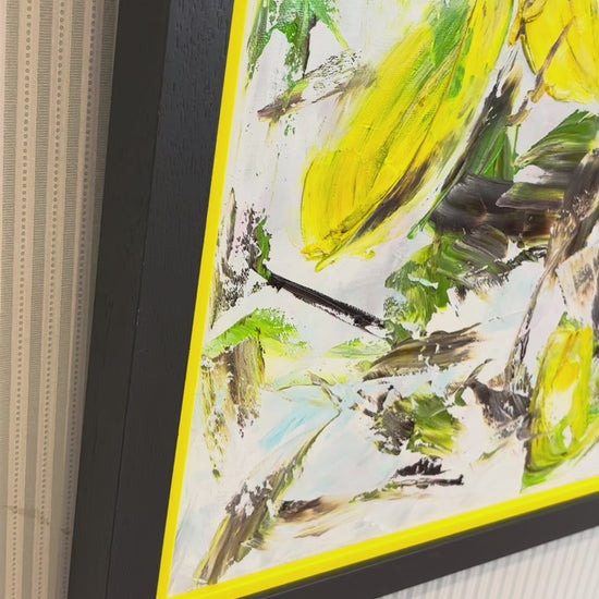 Bursting with colour and texture, this bold oil painting by Sabina Nealon will bring joy and energy to any space. Finished with a simple dark frame and bright yellow slip for added punch.