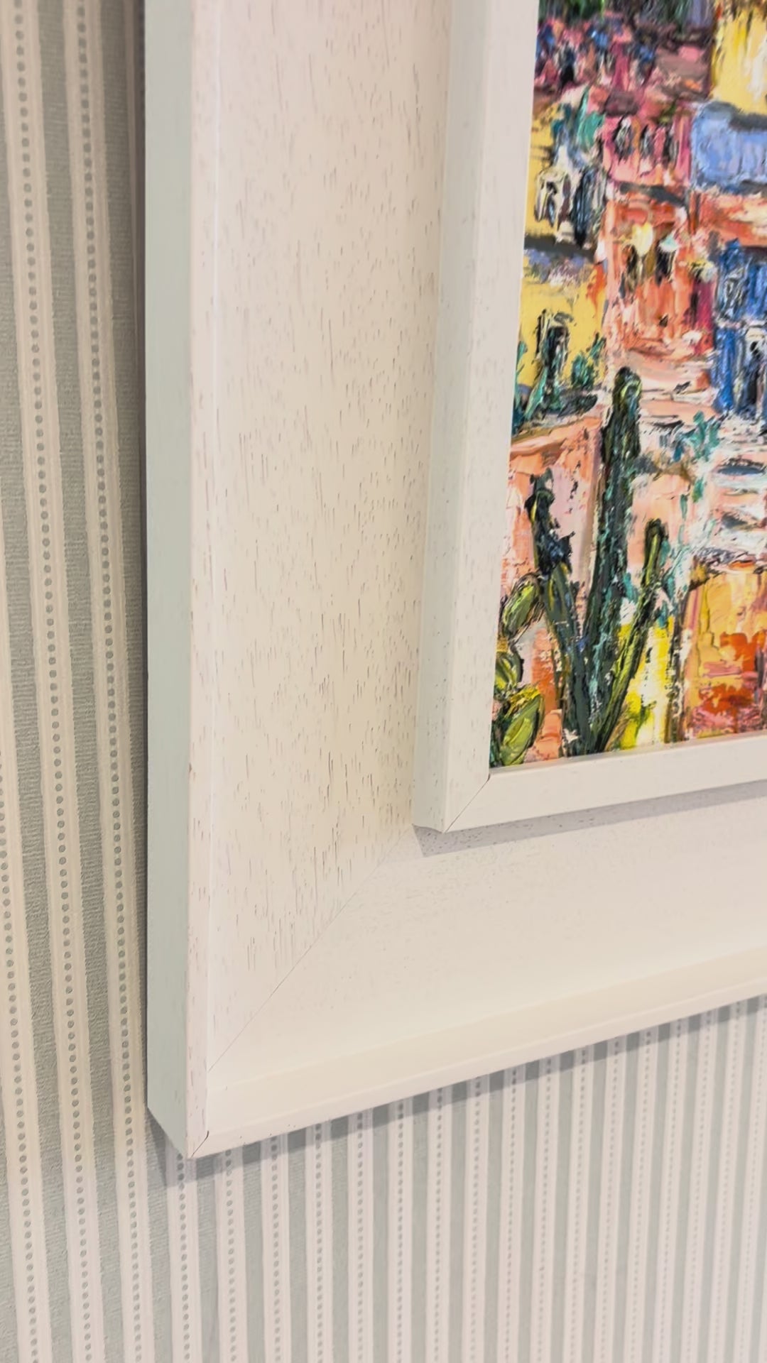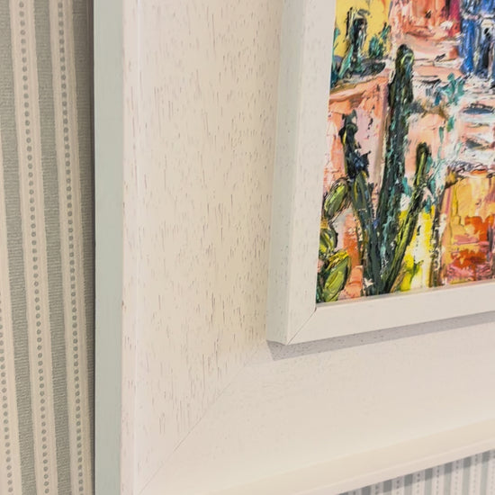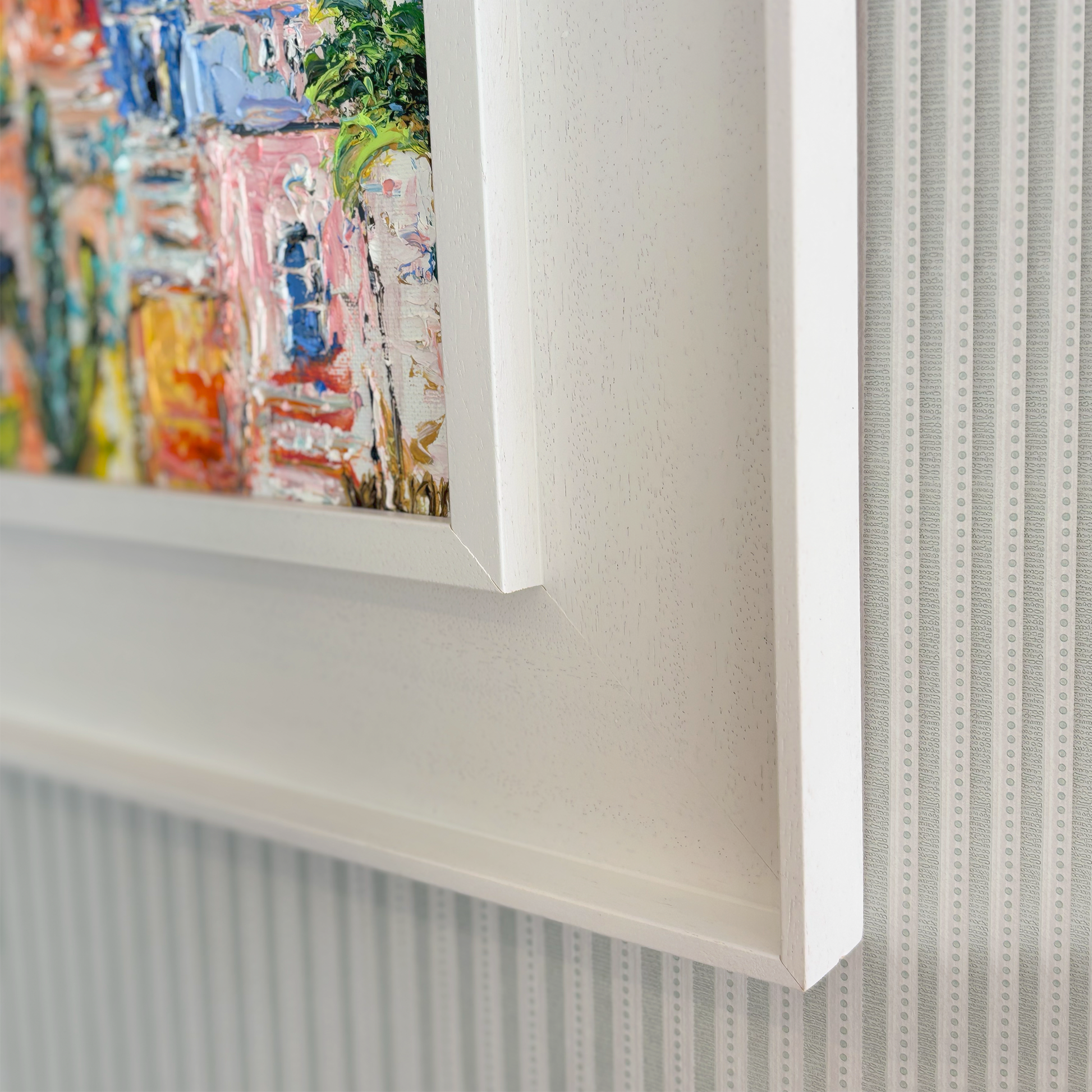 A vibrant, textured painting alive with colour and warmth, capturing the spirit of a Moroccan hillside town under a soft purple sky. The rich palette and expressive brushwork bring the buildings, palms, and atmosphere to life. Housed in an off‑white painted frame with a broad profile, balancing the vibrant scene beautifully.