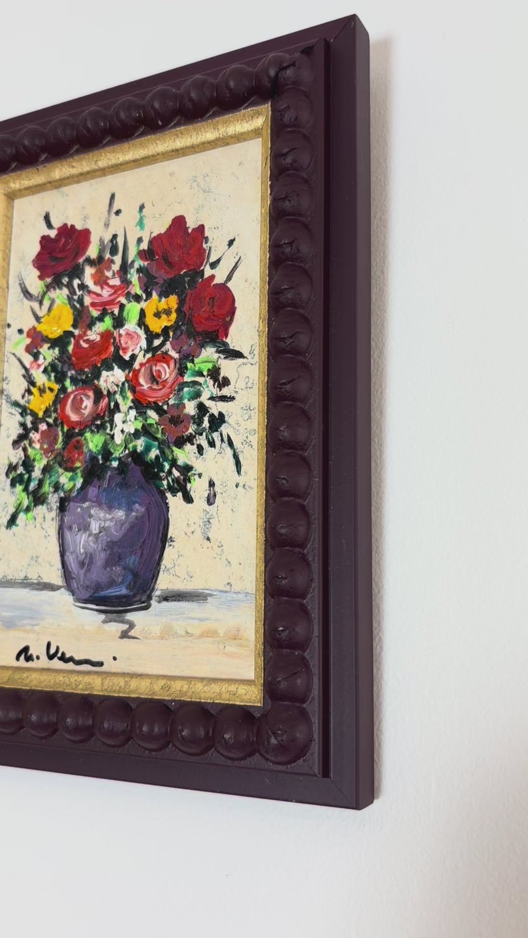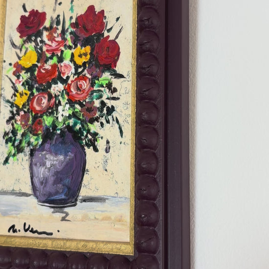 A joyful still life bursting with colour, perfectly complemented by its burgundy bobbin and gilt frame.