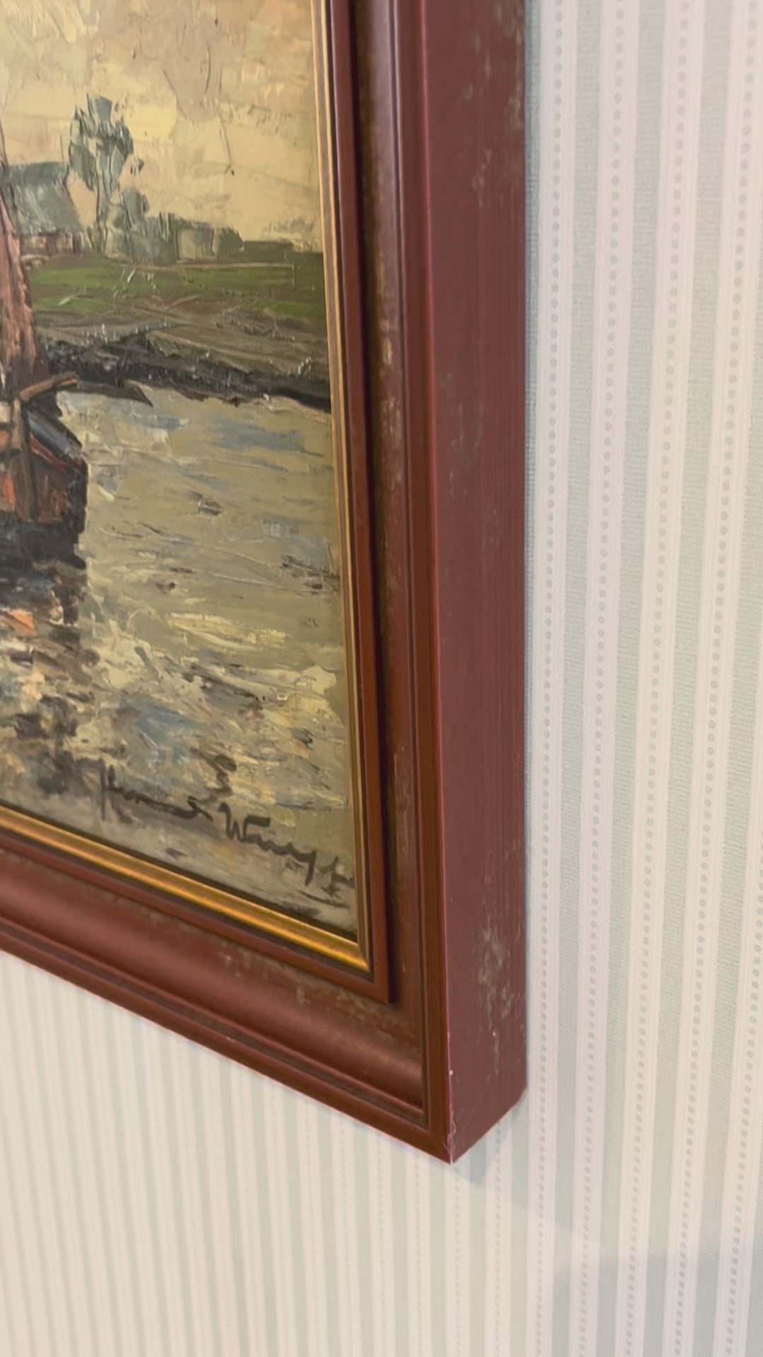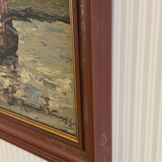 Rich in texture, this impasto harbour scene depicts a cluster of moored boats catching the fading light. Finished in a warm bergundy frame with gold slip, this is a sophisticated piece with plenty of character.