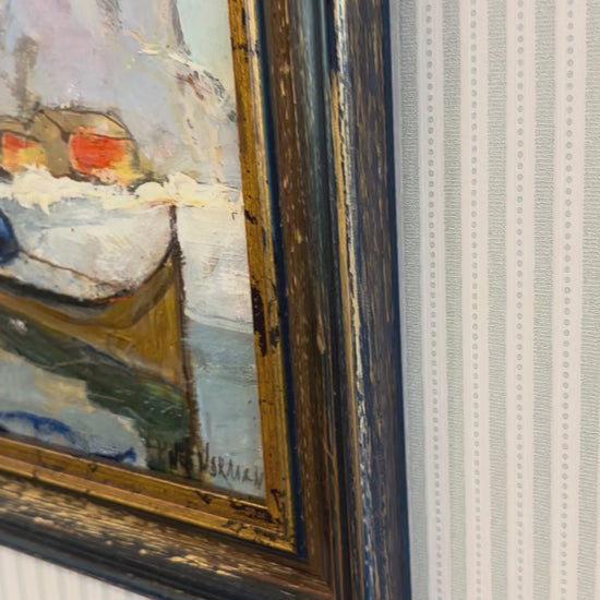 An expressive oil painting by Scandinavian artist Knut Norman, capturing moored boats set against a dramatic mountain backdrop. This is an impressive and versatile piece framed in dark wood with gilt edging and suits a range of interiors.