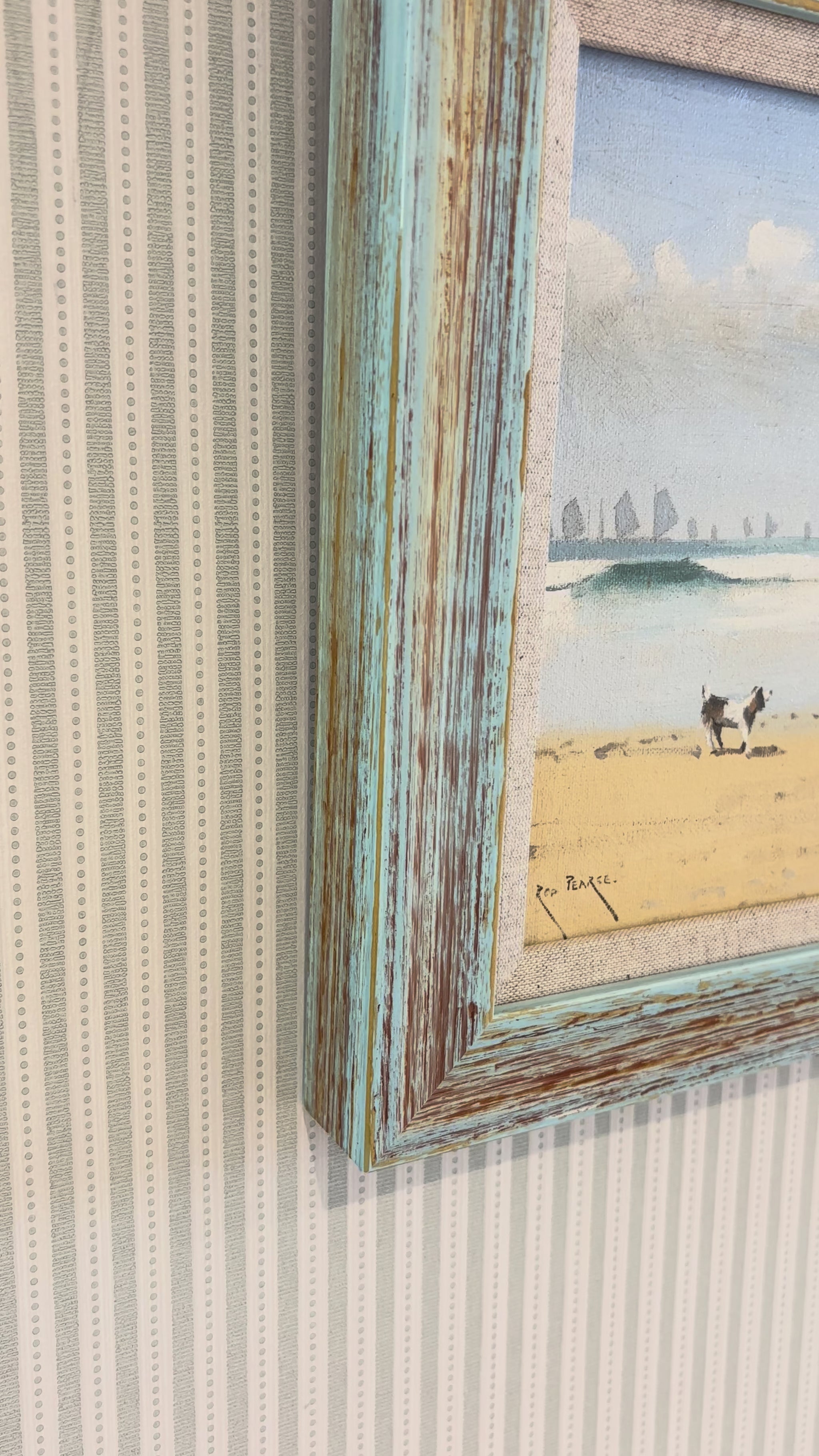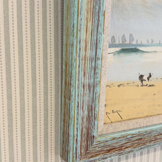 A tranquil beachside scene featuring two horseback riders which is full of delicate detail and coastal charm. Presented in a distressed turquoise frame, this artwork is a favourite of ours for its character and elegance.