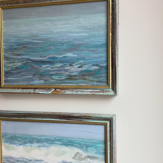 This artwork by Norma Taylor conveys the stillness of the open sea, enhanced by a charming teal and gilt frame that complements the maritime mood.