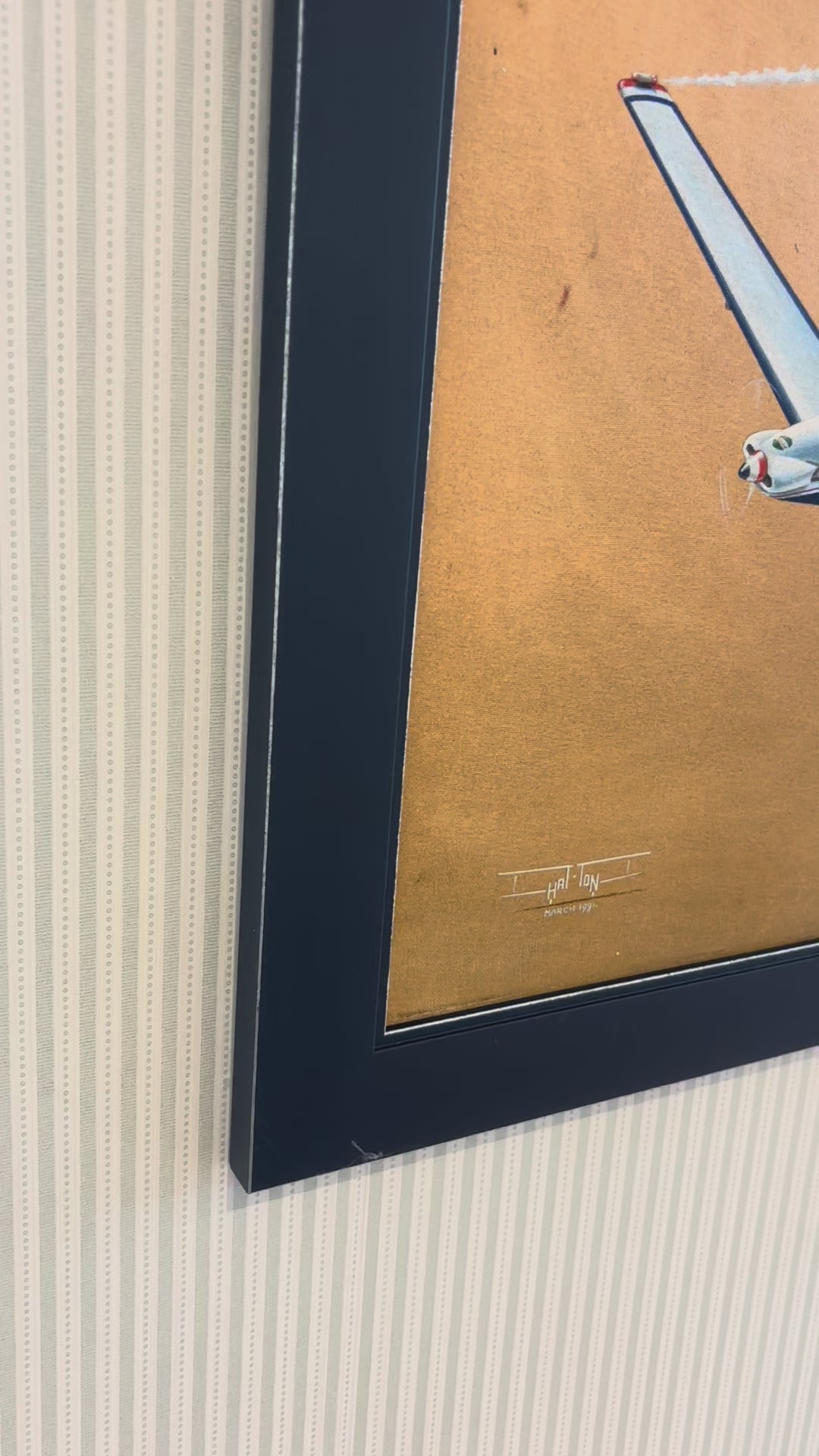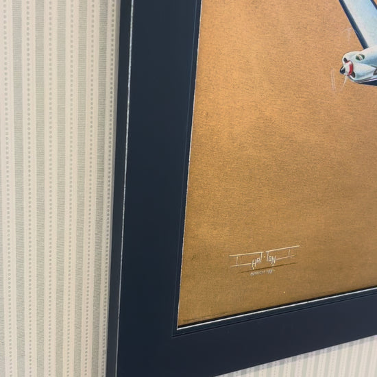 With crisp detail and striking perspective, the three aircraft soar across a warm ochre background. Set in a sleek deep blue frame with gilt edging, this is a perfect artwork for a boys bedroom or any aviation enthusiast.