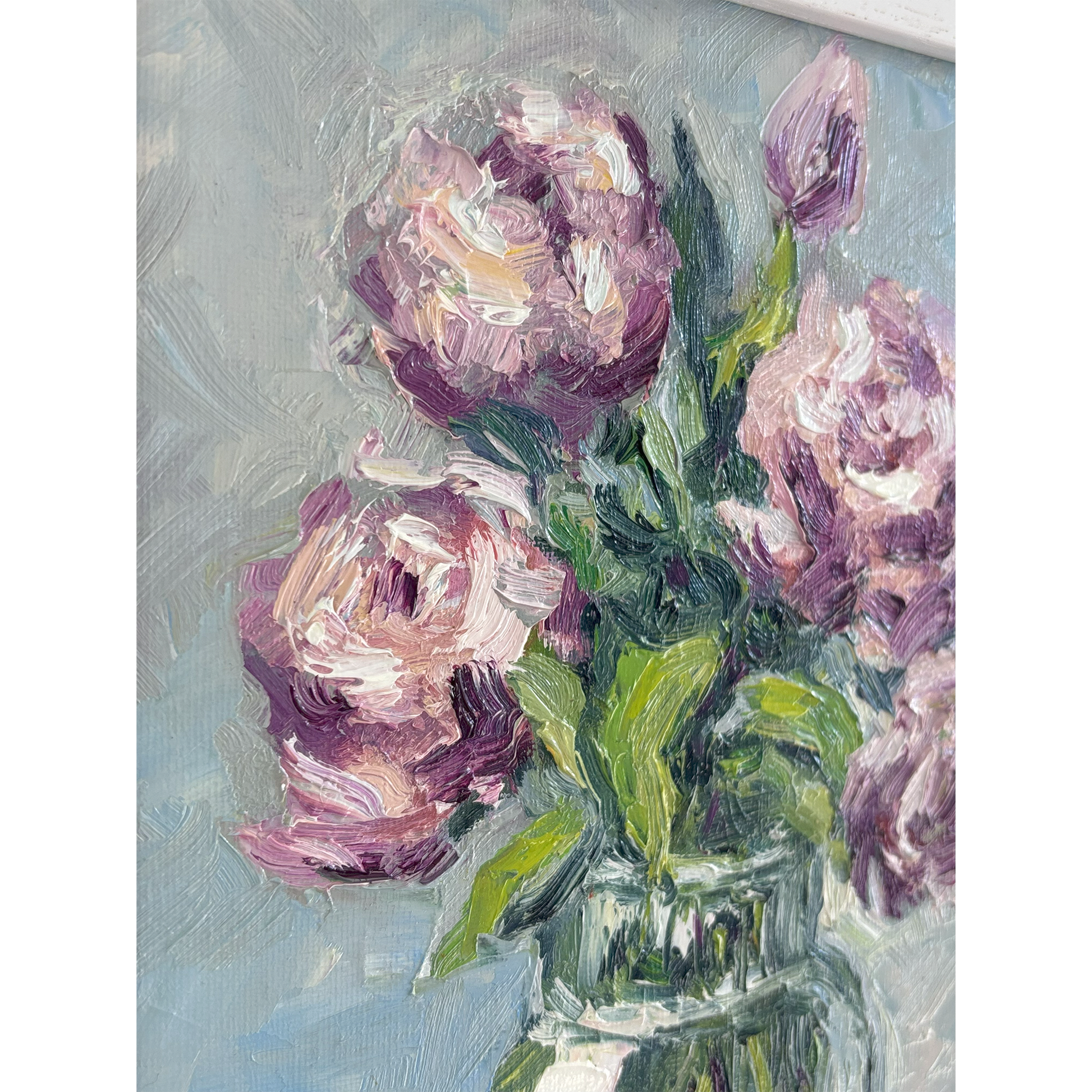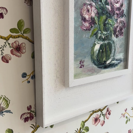 A lively little painting of rich purple peonies, full of colour and charm. Housed in an off‑white painted frame with a broad profile that sets off the vibrant flowers beautifully.