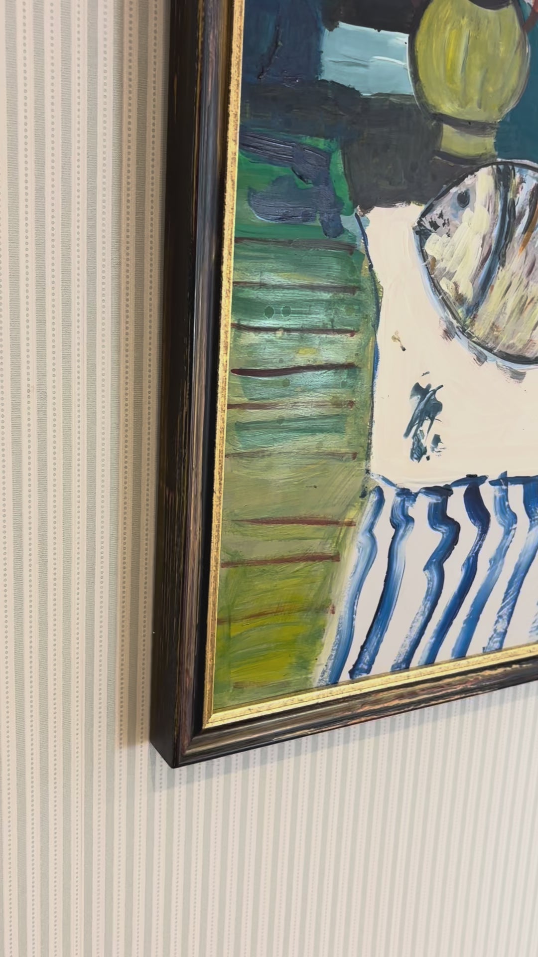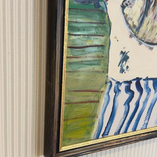 This expressive still life pairs a timeless tabletop scene with rich colour and character. A classic subject, reimagined with contemporary flair and set in a rich antique-style frame with gilt detailing.