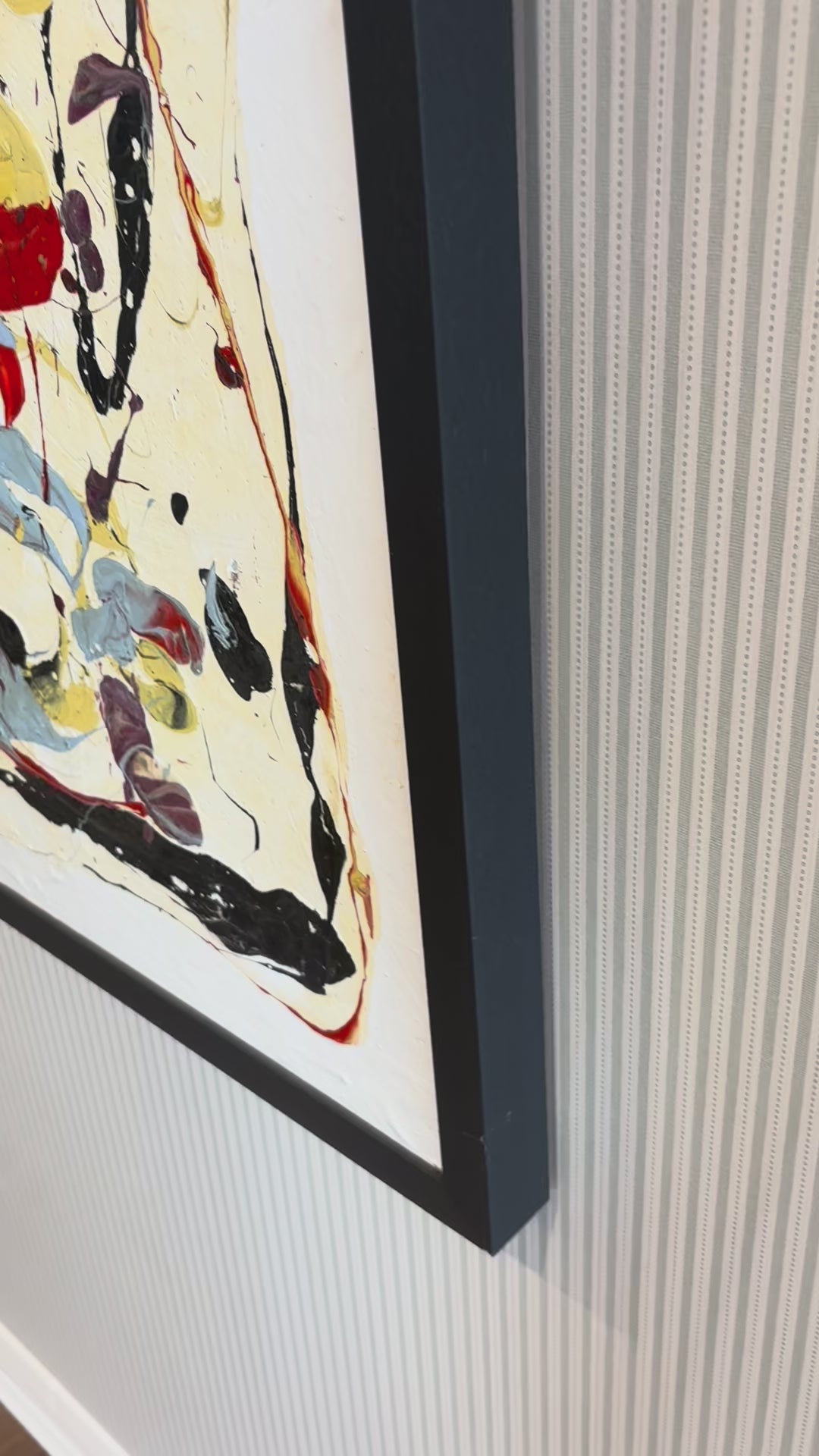 This large-scale abstract bursts with layered colour and texture. A bold and expressive statement piece that invites the eye to roam, set in a simple dark frame for maximum impact.