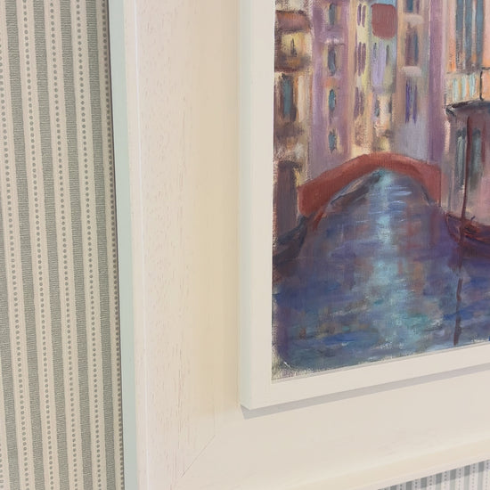 Bathed in warm hues and lively brushstrokes, this original painting by George Miller framed in soft white wood captures the tranquil beauty of Venice’s canals at golden hour.